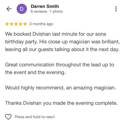 ✅ Wide Range of Magical Styles-Whether you’re hosting a wedding, corporate event, or private party in Leamington Spa, Dvishan offers close-up/table magic, walkaround performances, mind reading, and stage shows tailored to your occasion.